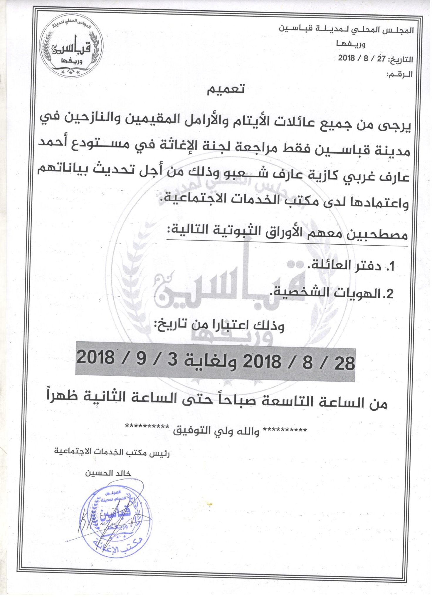 تعميم من المجلس المحلي إلى جميع عائلات ا لأيتام والأرامل والنازحين المقيمين في المدينة من أجل تحديث بياناتهم