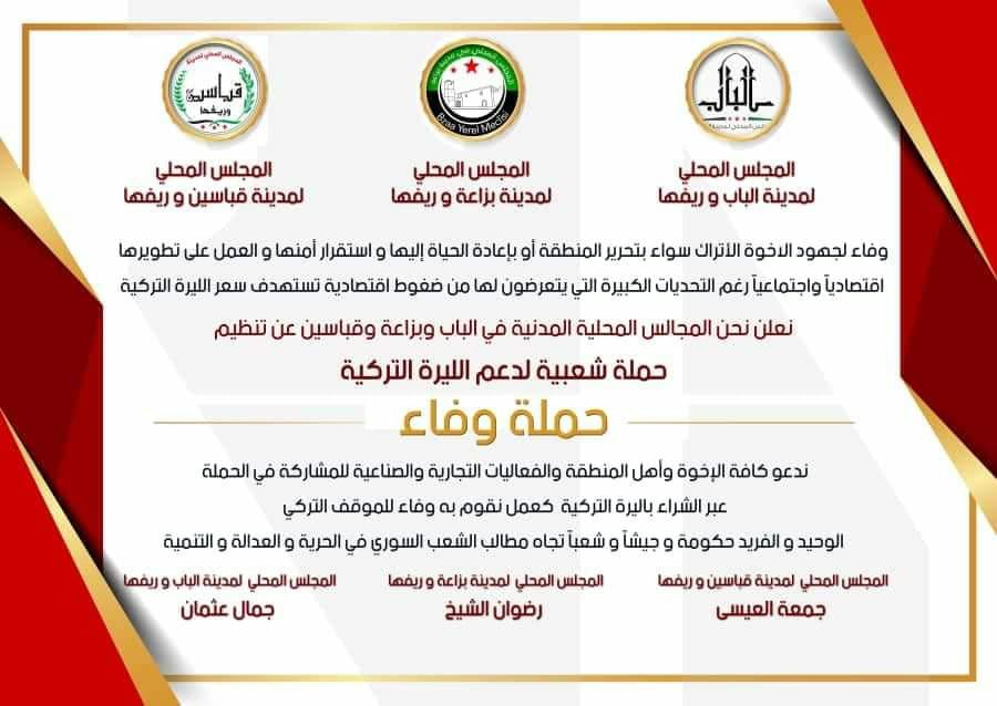 بيان من المجالس المحلية في مدينة الباب وبزاعة وقباسين يعلنون فيه عن إطلاق حملة شعبية لدعم الليرة التركية
