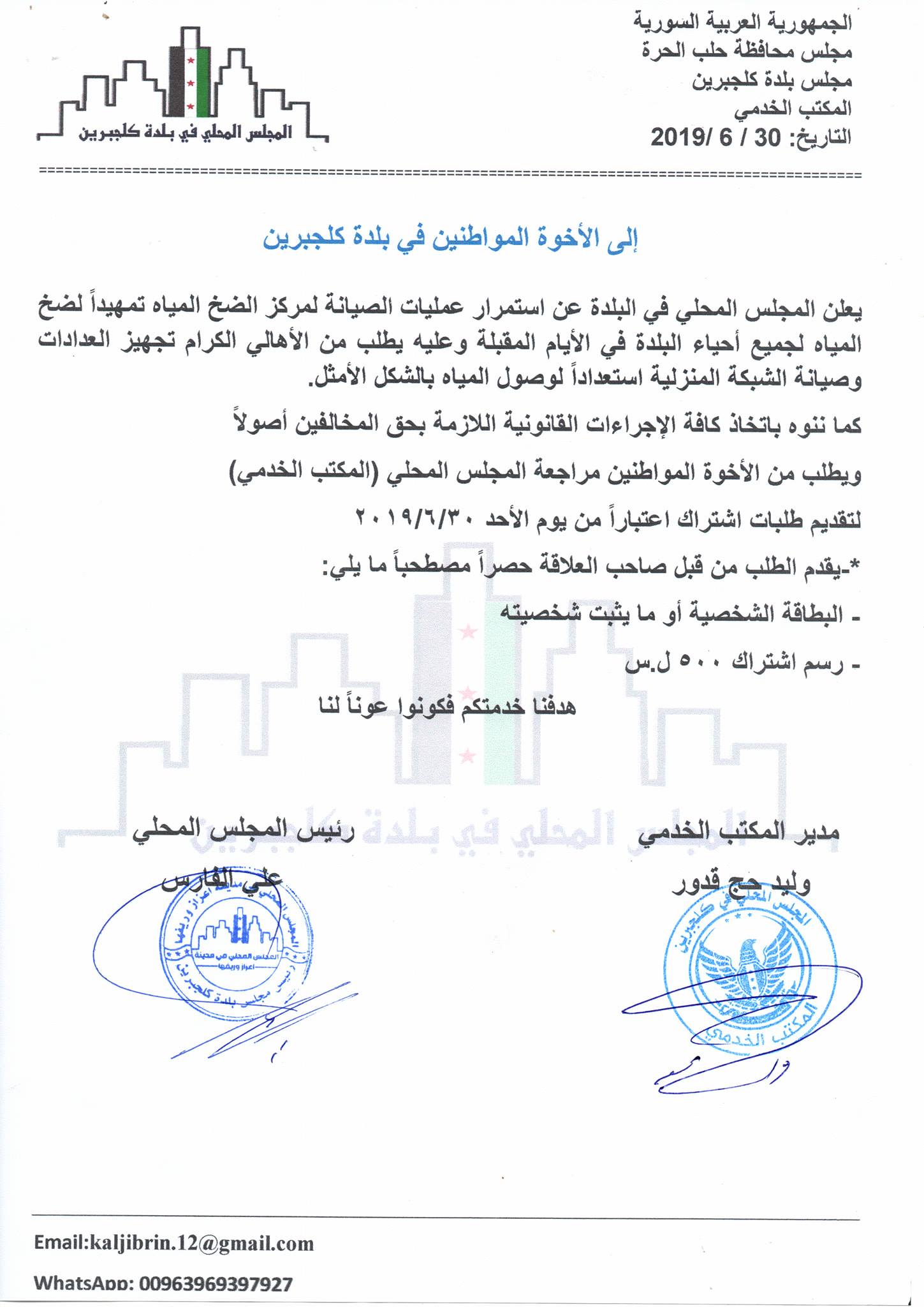 إعلان من المجلس المحلي في بلدة كلجبرين عن البدء باستقبال طلبات استجرار المياه بعد اقتراب الانتهاء من اعمال الصيانة في مركز الضخ والشبكة