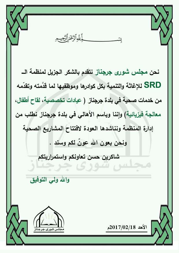 بيان شكر من مجلس شورى جرجناز لمنظمة SRD للإغاثة والتنمية على ما قدمته من خدمات صحية لبلدة جرجناز
