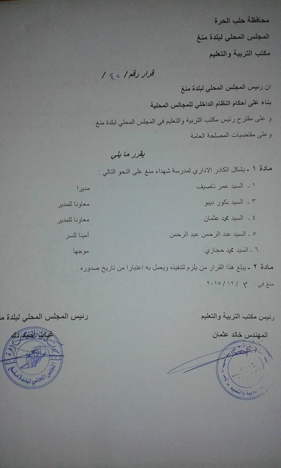 قرار من المجلس المحلي لبلدة منغ وريفها بتعيين الكادر الإداري لمدرسة شهداء منغ