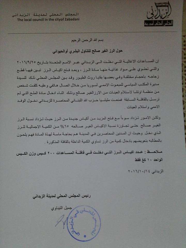 بيان من المجلس المحلي لمدينة الزبداني حول الرز الذي ادخل بالمساعدات الاغاثية الى الزبداني