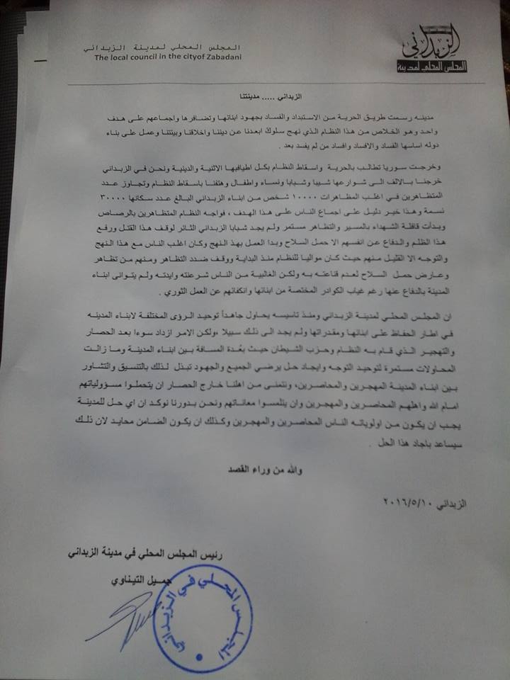 بيان من المجلس المحلي لمدينة الزبداني حول جهوده منذ تأسيسه في توحيد جهود ورؤى أبناء المدينة