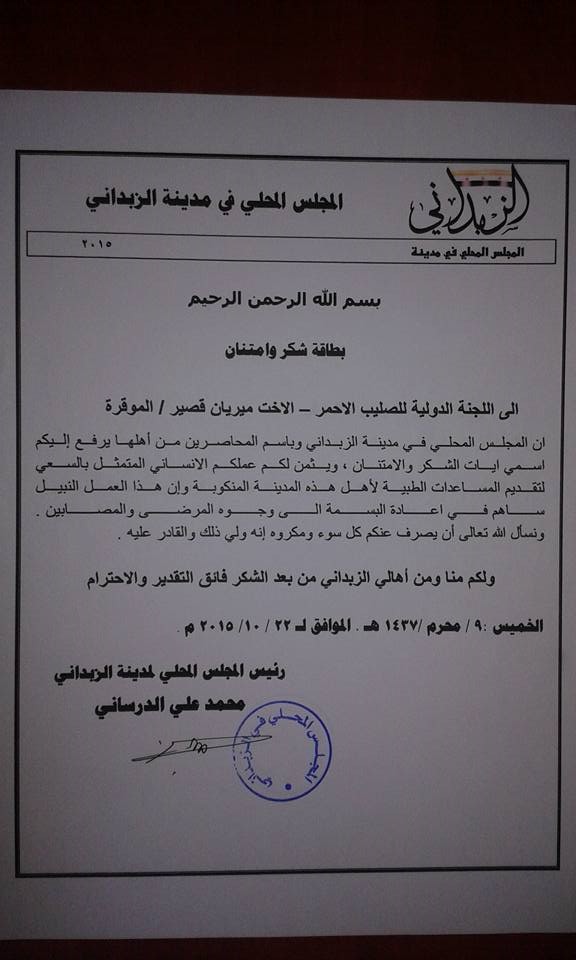 بيان شكر من المجلس المحلي لمدينة الزبداني إلى اللجنة الدولية للصليب الأحمر لعملها الإنساني في تقديم المساعدات الطبية والإنسانية لأهالي المدينة المحاصرة المنكوبة