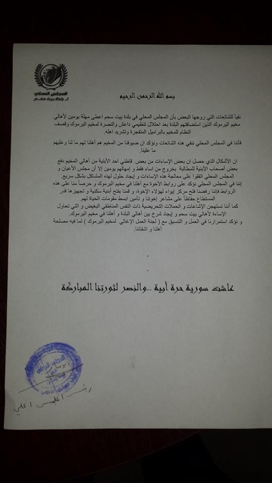 نفياً للشائعات التي روجها البعض بأن المجلس المحلي بلدة بيت سحم اعطى مهلة يومين لأهالي مخيم اليرموك الذين استضافتهم البلدة بعد احتلال تنظيمي داعش و النصرة لمخيم اليرموك و قصف النظام للمخيم بالبراميل المتفجرة.
