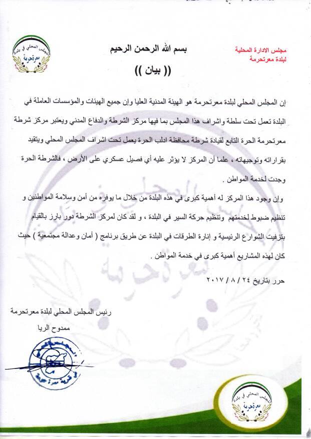 بيان من المجلس المحلي في بلدة معرة حرمة يؤكد كونه الهيئة المدنية العليا وأن جميع الهيئات والمؤسسات العاملة في البلدة تعمل تحت سلطته وإشرافه