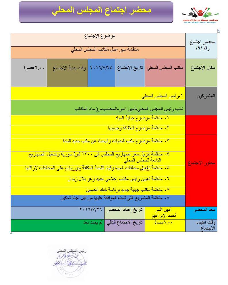 محضر اجتماع المجلس المحلي لمناقشة المواضيع والنشاطات والخطط القادمة