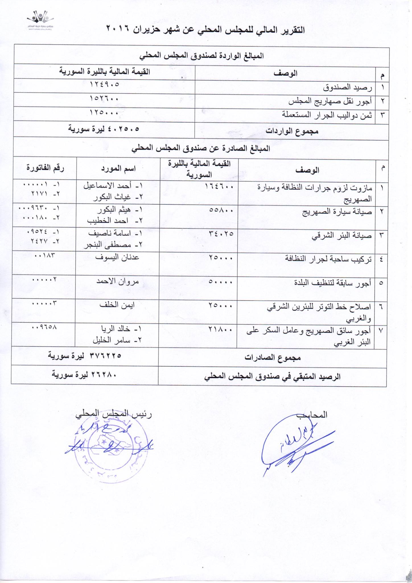 التقرير المالي الصادر عن المجلس المحلي لشهر حزيران 2016