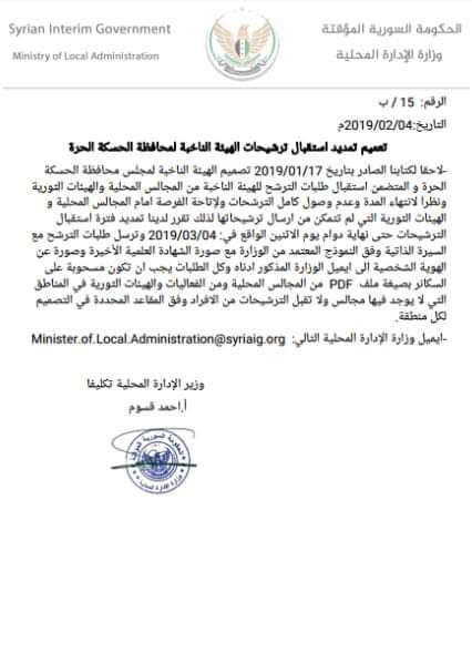 تعميم بشأن تمديد استقبال ترشيحات الهيئة الداخلية لمجلس محافظة الحسكة الحرة