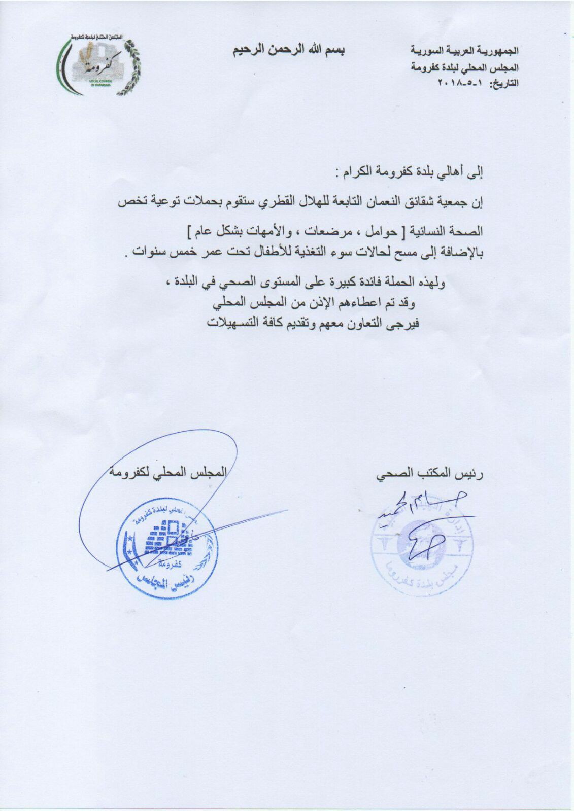 إعلان من المجلس المحلي لبلدة كفروما بشأن قيام منظمة شقائق النعمان بحملات توعية تخص الصحة النسائية
