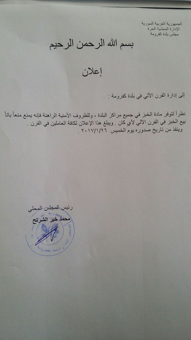 نظراً لتوفر مادة الخبز في جميع مراكز البلدة , وللظروف الأمنية الراهنة فإنه يمنع منعاً باتاً بيع الخبز في الفرن الآلي لأيٍ كان . ويبلغ هذا الأعلان لكافة العاملين في الفرن .