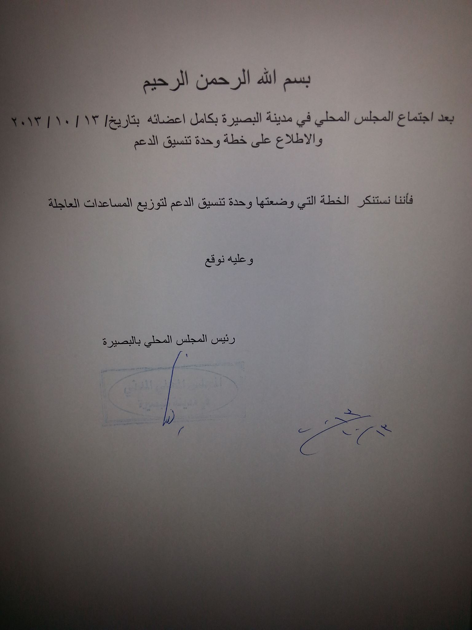 بيان من المجلس المحلي لمدينة البصيرة يستنكر في الخطة التي وضعتها وحدة تنسيق الدعم من أجل توزيع المساعدات