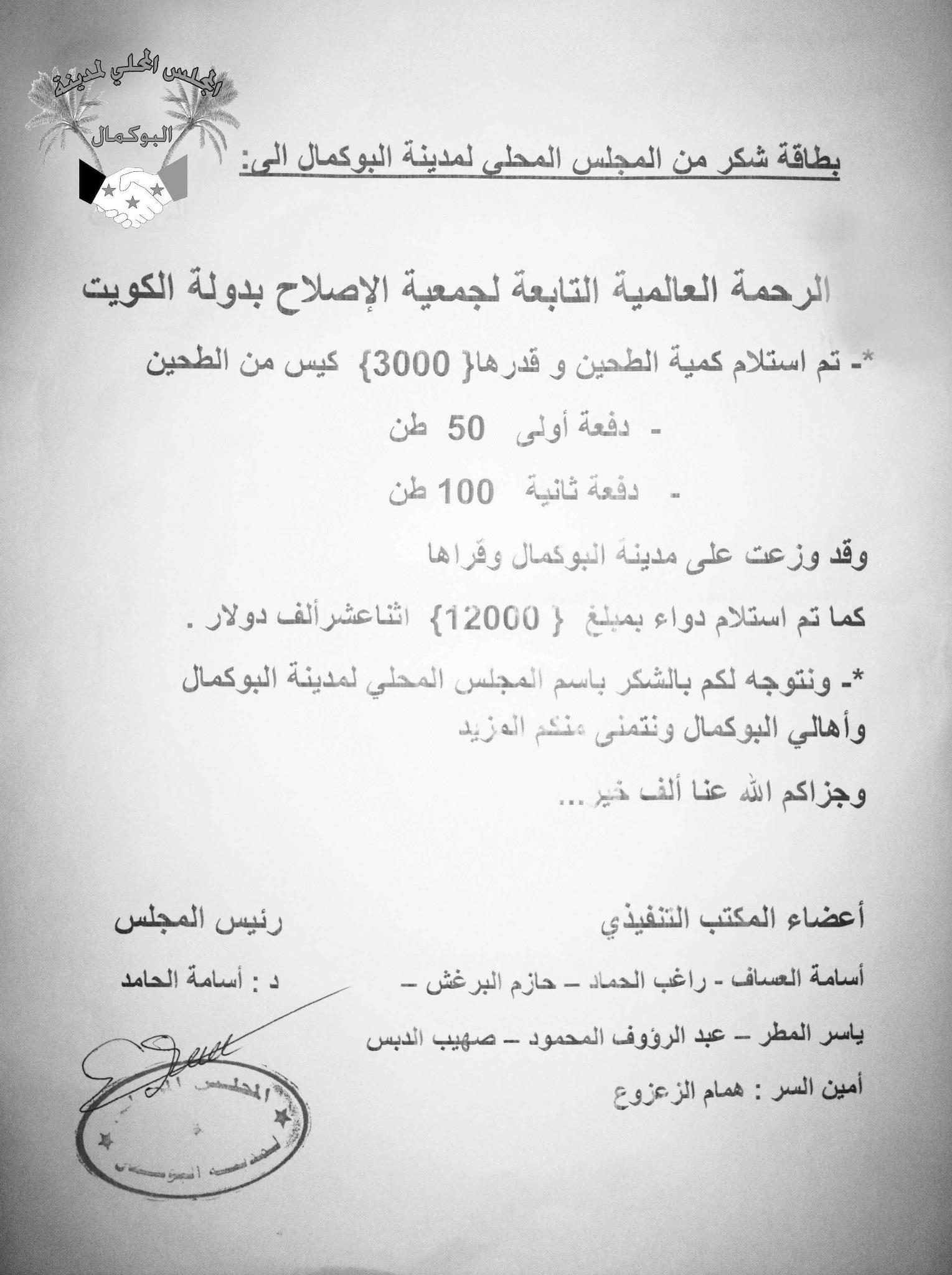 بيان شكر من المجلس المحلي لمدينة البوكمال إلى الرحمة العالمية التابعة لجمعية الاصلاح بدولة الكويت على تقديمهم مادة الطحين والدواء لأهالي المنطقة