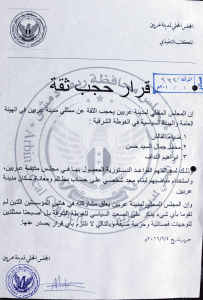 إن المجلس المحلي لمدينة عربين يحجب الثقة عن ممثلي مدينة عربين في الهيئة العامة والهيئة السياسية في الغوطة الشرقية :