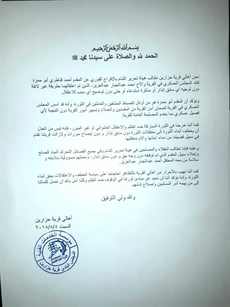 بيان من أهالي حزارين يطالبون فيه بالإفراج عن المقدم أحمد قناطري أبو حمزة قائد المجلس العسكري في القرية والأخ أحمد عبدالجبار عبدالعزيز اللذَين تم إعتقالهما من قبل عناصر هيئة تحرير الشام