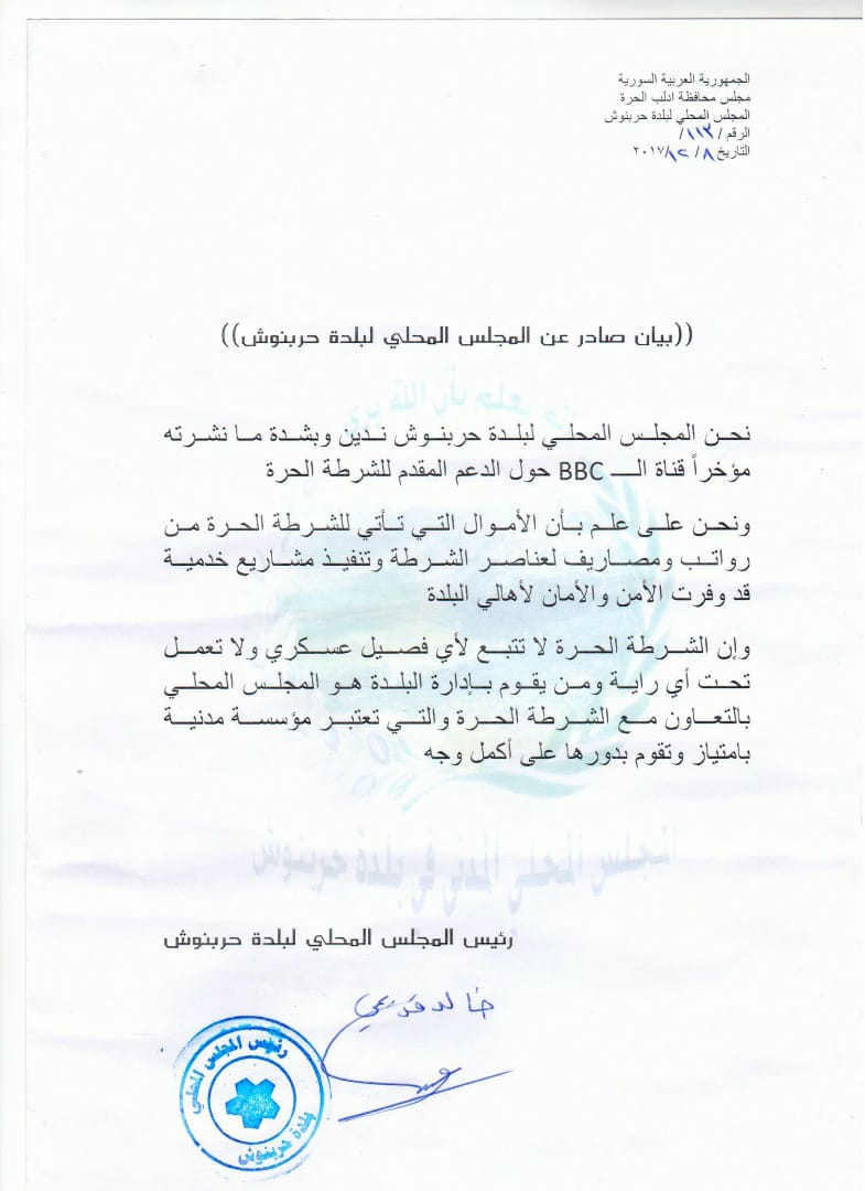 بيان من المجلس المحلي في بلدة حربنوش يدين فيه ما نشرته قناة بي بي سي حول الدعم المقدم للشرطة الحرة