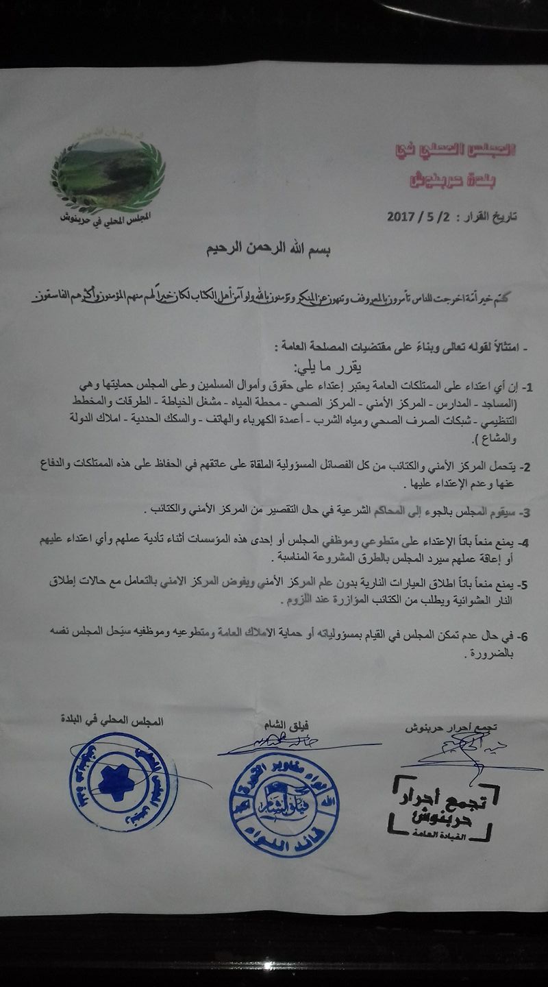 بيان اتفاق بين المجلس المحلي في بلدة حربنوش والفعاليات الثورية في البلدة فيما يخص مقتضيات المصلحة العامة