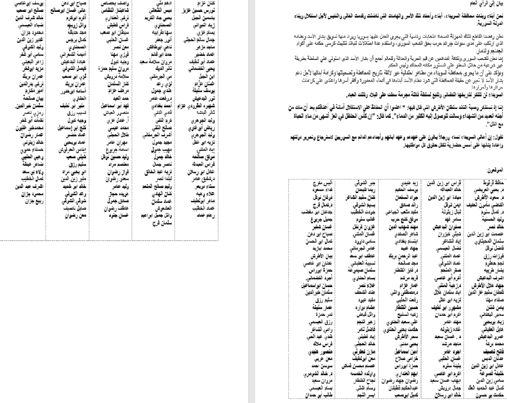 نقول: إن أهالي السويداء نساء ورجالاً باقون على عهدهم وعهد آبائهم وأجدادهم الدائم مع السوريين لاسترجاع وتحرير دولتهم وإعادة بنائها على أسس حضارية تكفل حقوق كل مواطنيها.