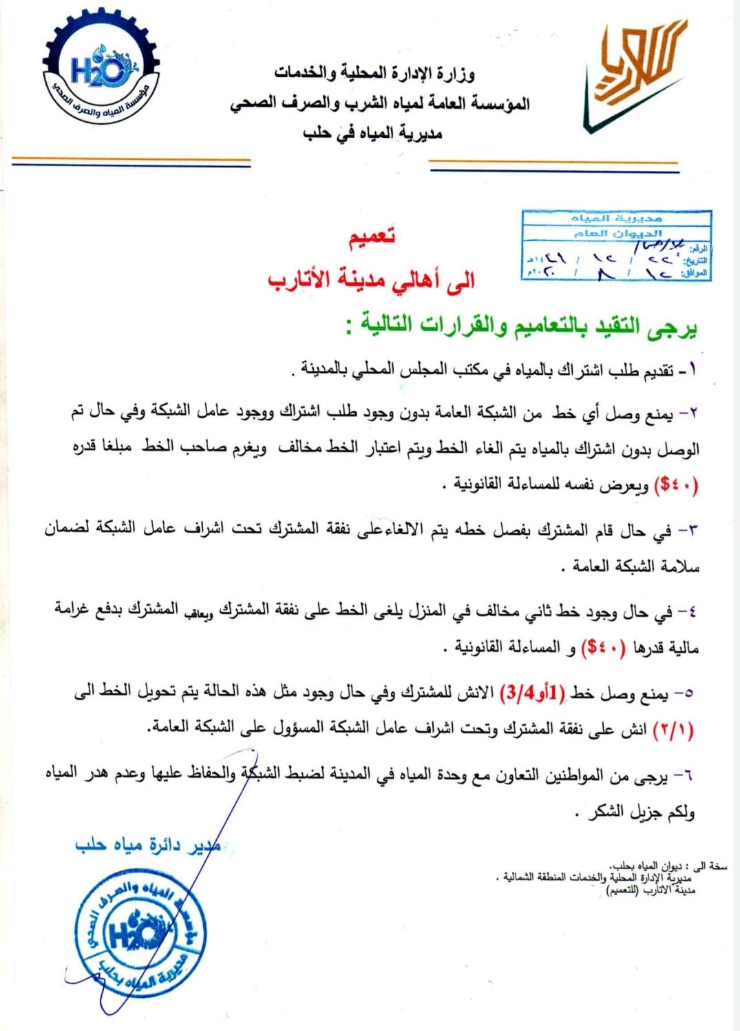 بيان تعميم من مديرية المياه بحلب لأهالي مدينة الأتارب بخصوص التقيد بالتعليمات والقرارات الصادرة عن المديرية