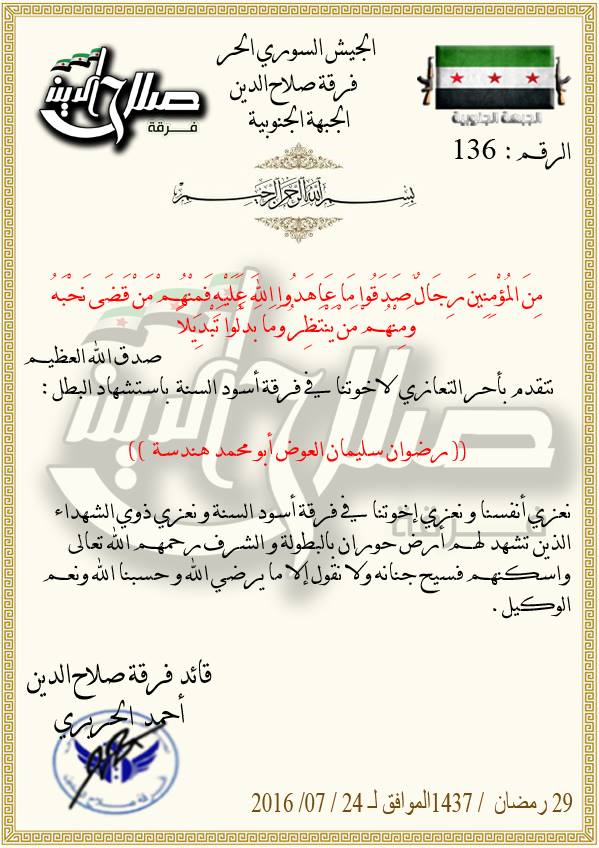 بيان من فرقة صلاح الدين تعزي فيه فرقة أسود السنة بأحد عناصرها