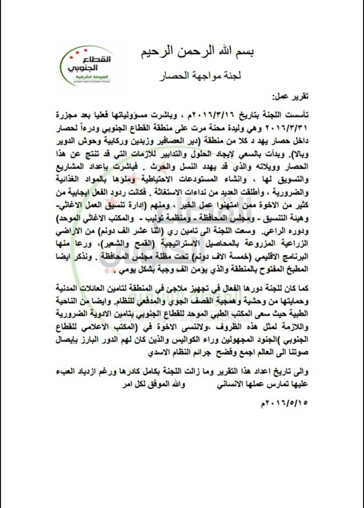 تقرير من المجلس المحلي المدني لبلدة دير العصافير حول عمل لجنة مكافحة الحصار