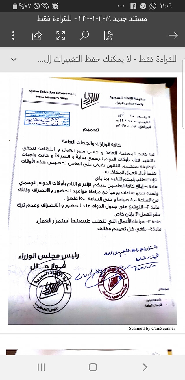 تعميم من حكومة الإنقاذ السورية إلى كافة الوزارات والجهات العامة بخصوص التقيد التام بأوقات الدوام الرسمي بداية وانصرافا