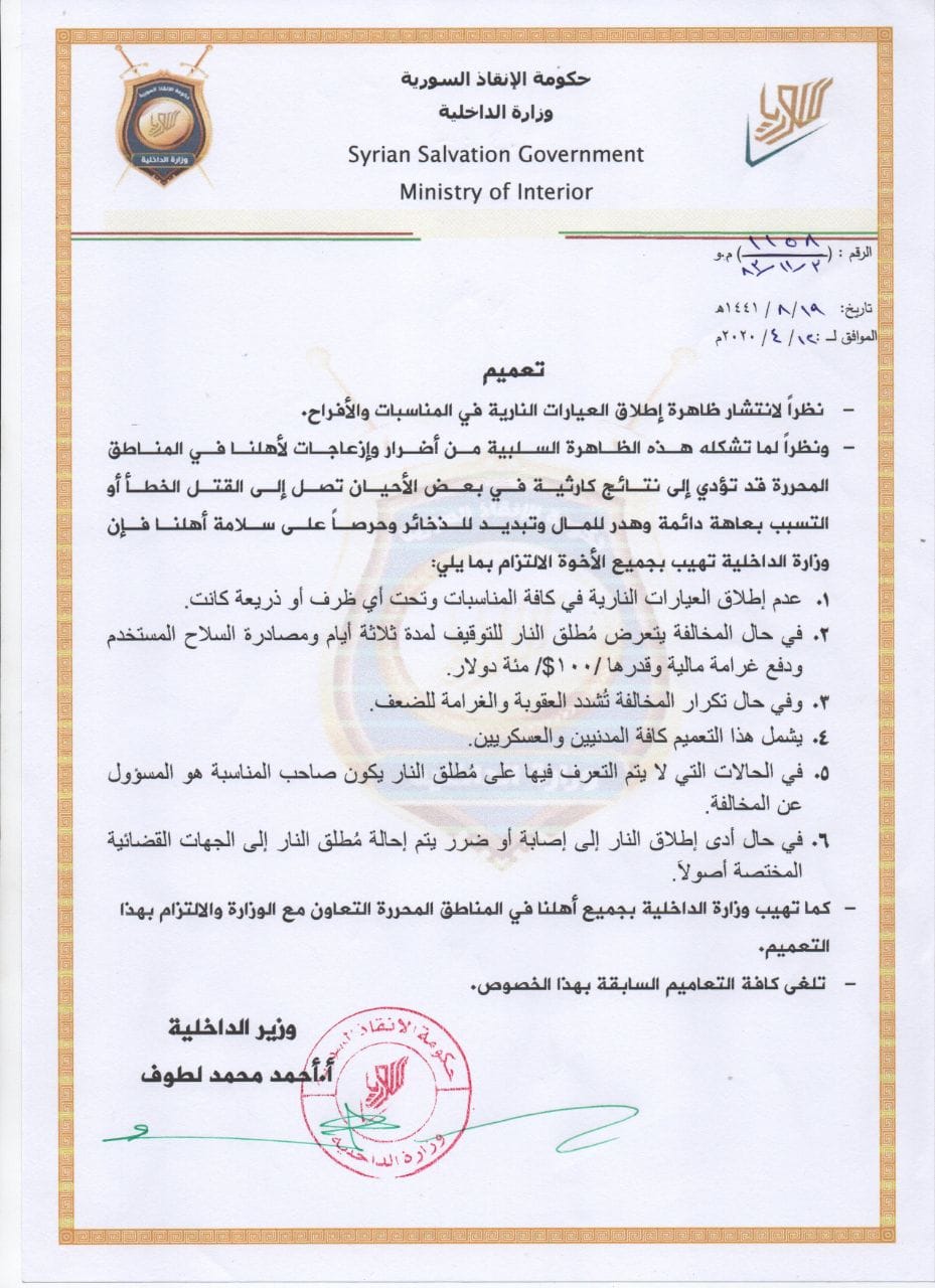 تعميم صادر عن حكومة الإنقاذ السورية بما يخص حالات اطلاق العيارات النارية بالأفراح والأتراح