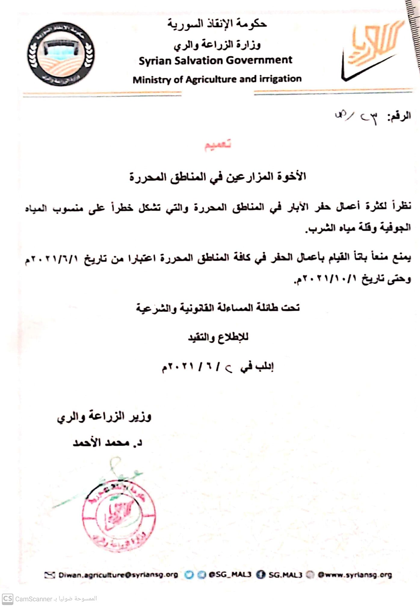تعميم من وزارة الزراعة في حكومة الإنقاذ بمنع حفر الآبار اعتباراً من 1/6/2021 وحتى 1/10/2021