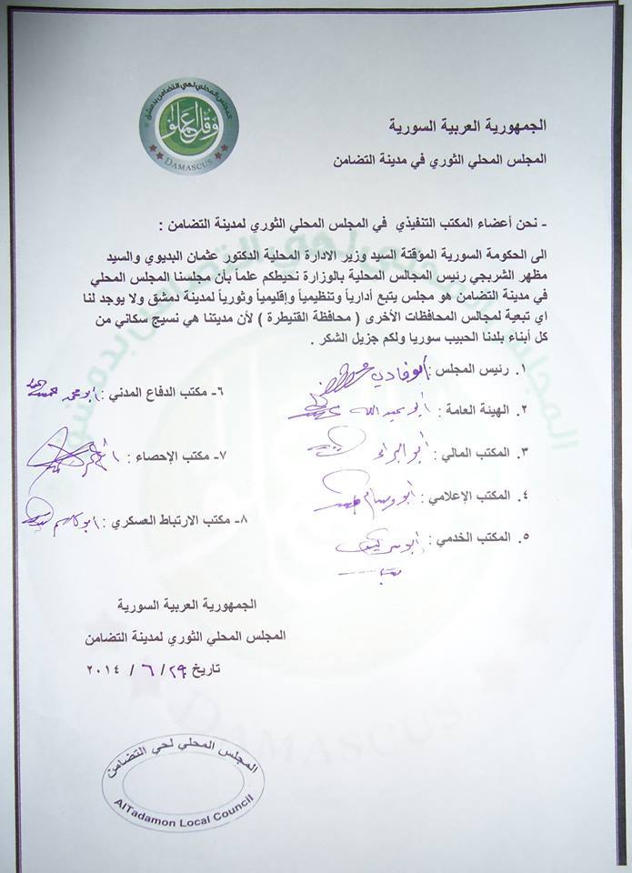 بيان من المجلس المحلي في حي التضامن بدمشق إلى وزارة الإدارة المحلية في الحكومة المؤقتة يؤكد فيه تبعية المجلس إدارياَ وتنظيمياً لمدينة دمشق