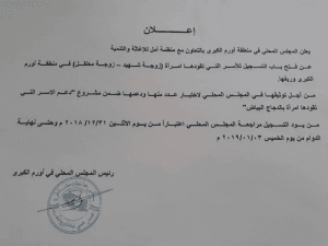 إعلان من المجلس المحلي لبلدة اورم الكبرى حول فتح باب التسجيل للأسر التي تقودها امرأة وذلك بالتعاون مع منظمة أمل للإغاثة والتنمية