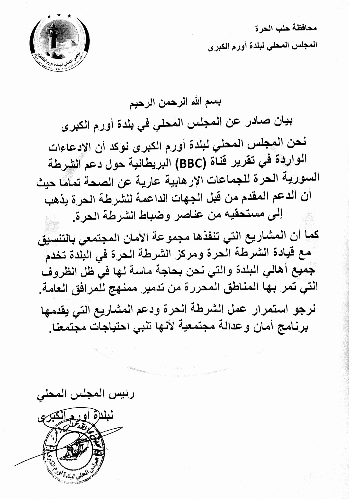 بيان من المجلس المحلي لبلدة اورم الكبرى يؤكد فيه للإدعاءات التي نشرتها قناة ال BBC بخصوص الدعم المقدم للشرطة الحرة