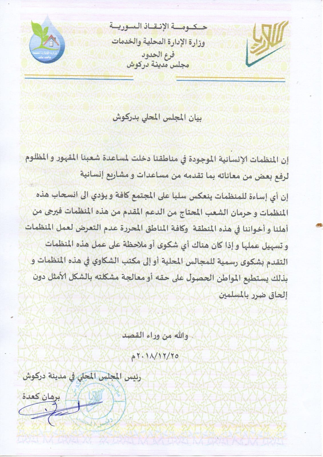 بيان من المجلس المحلي في مدينة دركوش بشأن عدم الإساءة للمنظمات الإنسانية