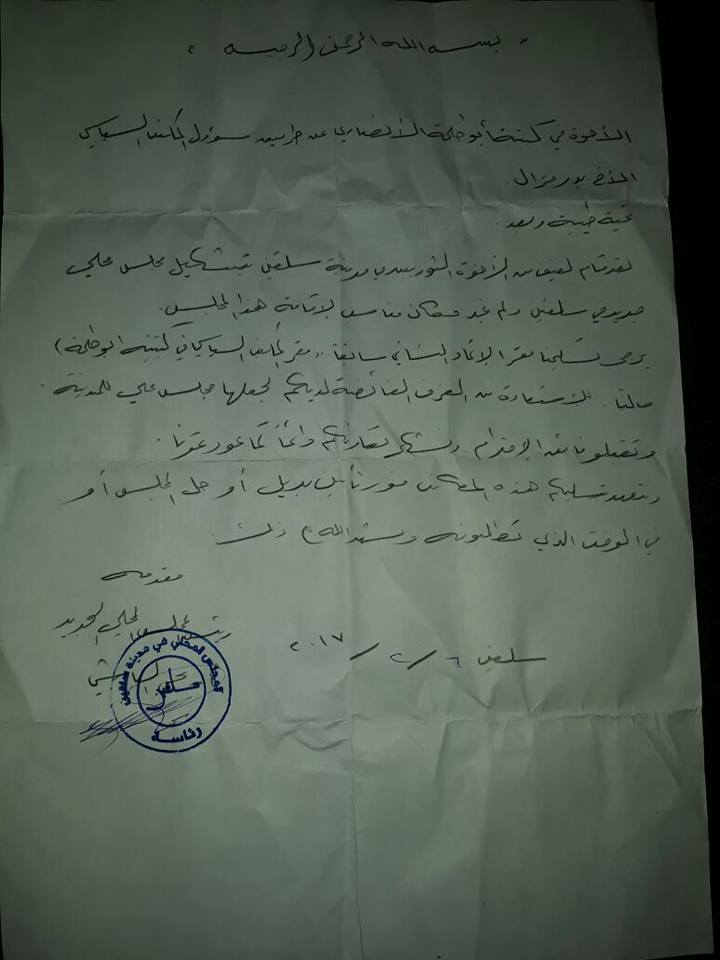 بيان من المجلس المحلي في مدينة سلقين يطالب فيه كتيبة أبو طلحة الأنصاري تسليم مقر الإتحاد النسائي ليكون مقراً للمجلس المحلي الجديد