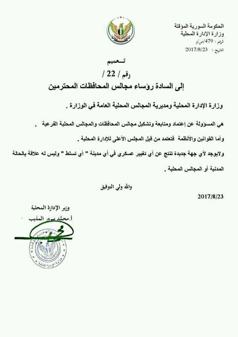 تعميم من وزارة الإدارة المحلية إلى رؤوساء مجالس المحافظات حول كون الوزارة هي المسؤولة عن اعتماد وتشكيل مجالس المحافظات والمجالس الفرعية