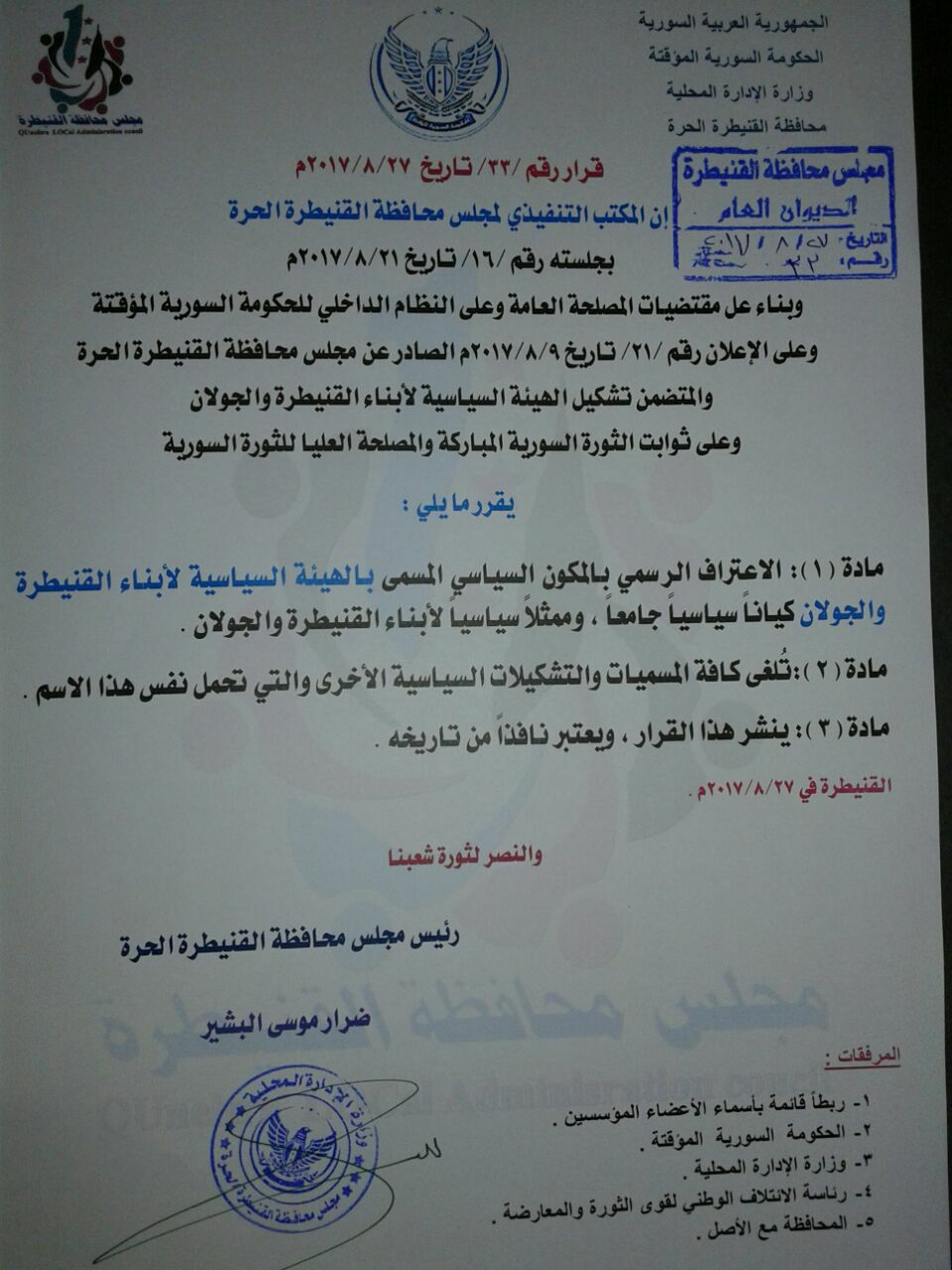 قرار من مجلس محافظة القنيطرة حول اعترافه بالمكون السياسي المسمى بالهيئة السياسية لأبناء القنيطرة والجولان كممثل سياسي لأبناء المنطقة