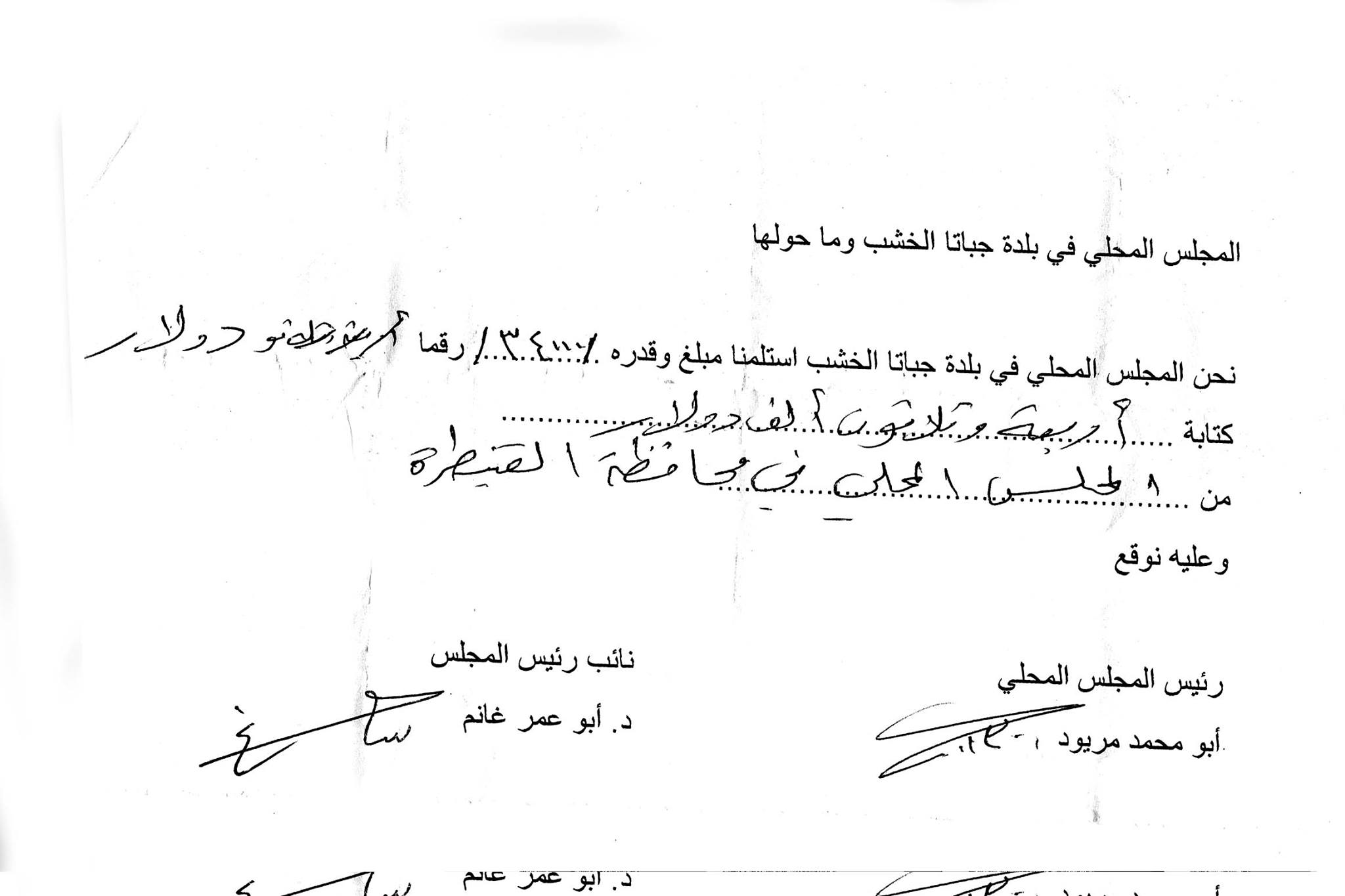تقرير من المجلس المحلي لبلدة جباتا الخشب حول استلامه من المجلس المحلي لمحافظة القنيطرة مبلغ 34 ألف دولار