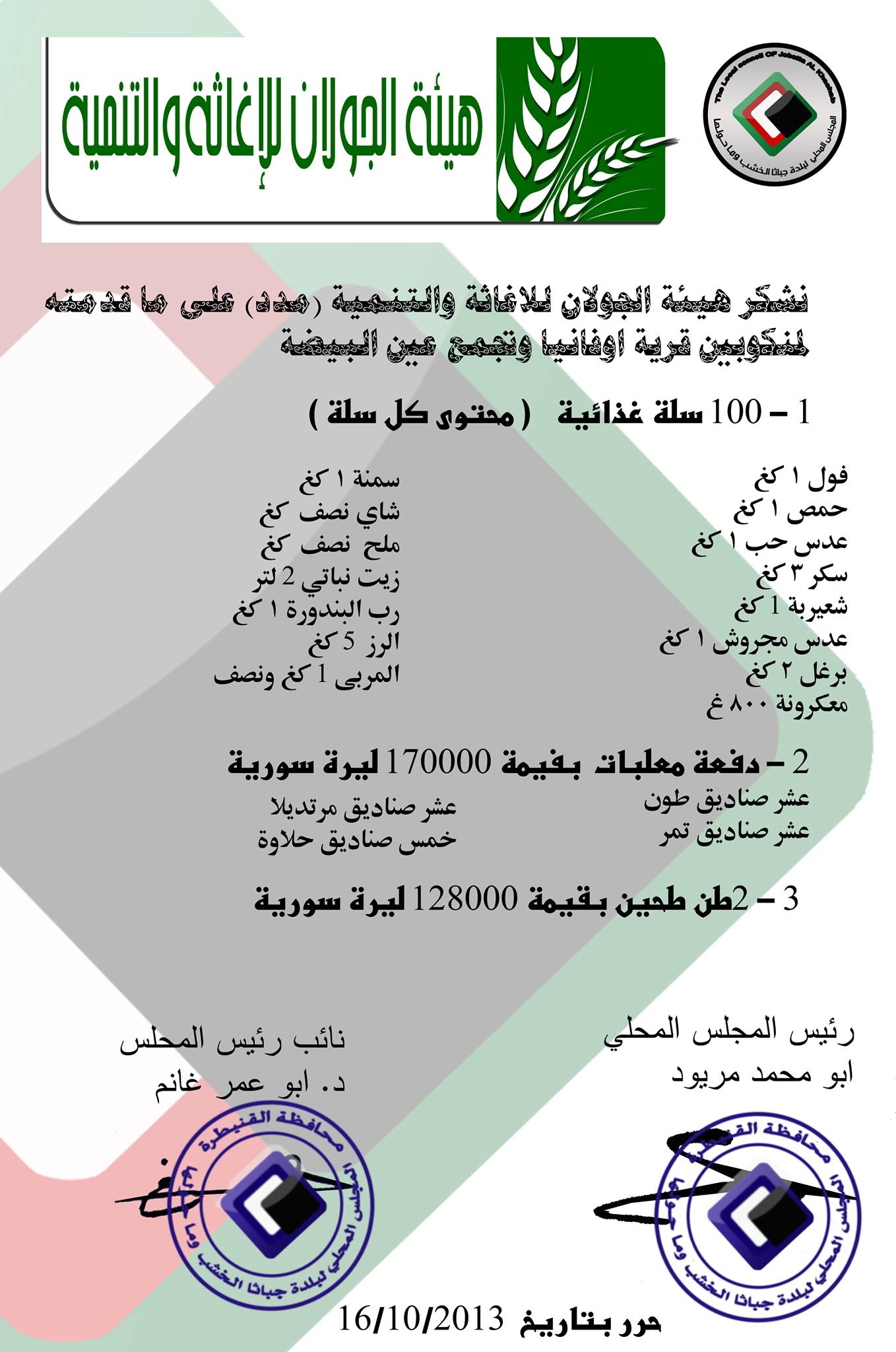 المجلس المحلي في بلدة جباتا الخشب وماحولها لهيئة الجولان للإغاثة والتنمية على ما قدمته من دعم للمنكوبين