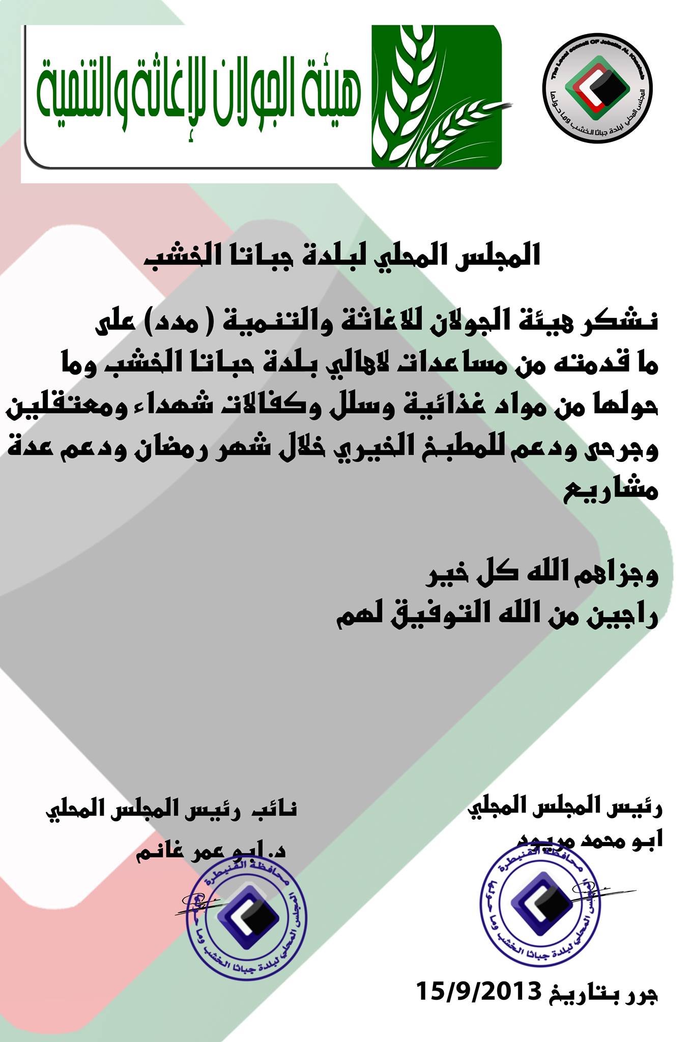 المجلس المحلي في بلدة جباتا الخشب وماحولها لهيئة الجولان للإغاثة والتنمية على ما قدمته من مساعدات وسلل إغاثية لأهالي البلدة