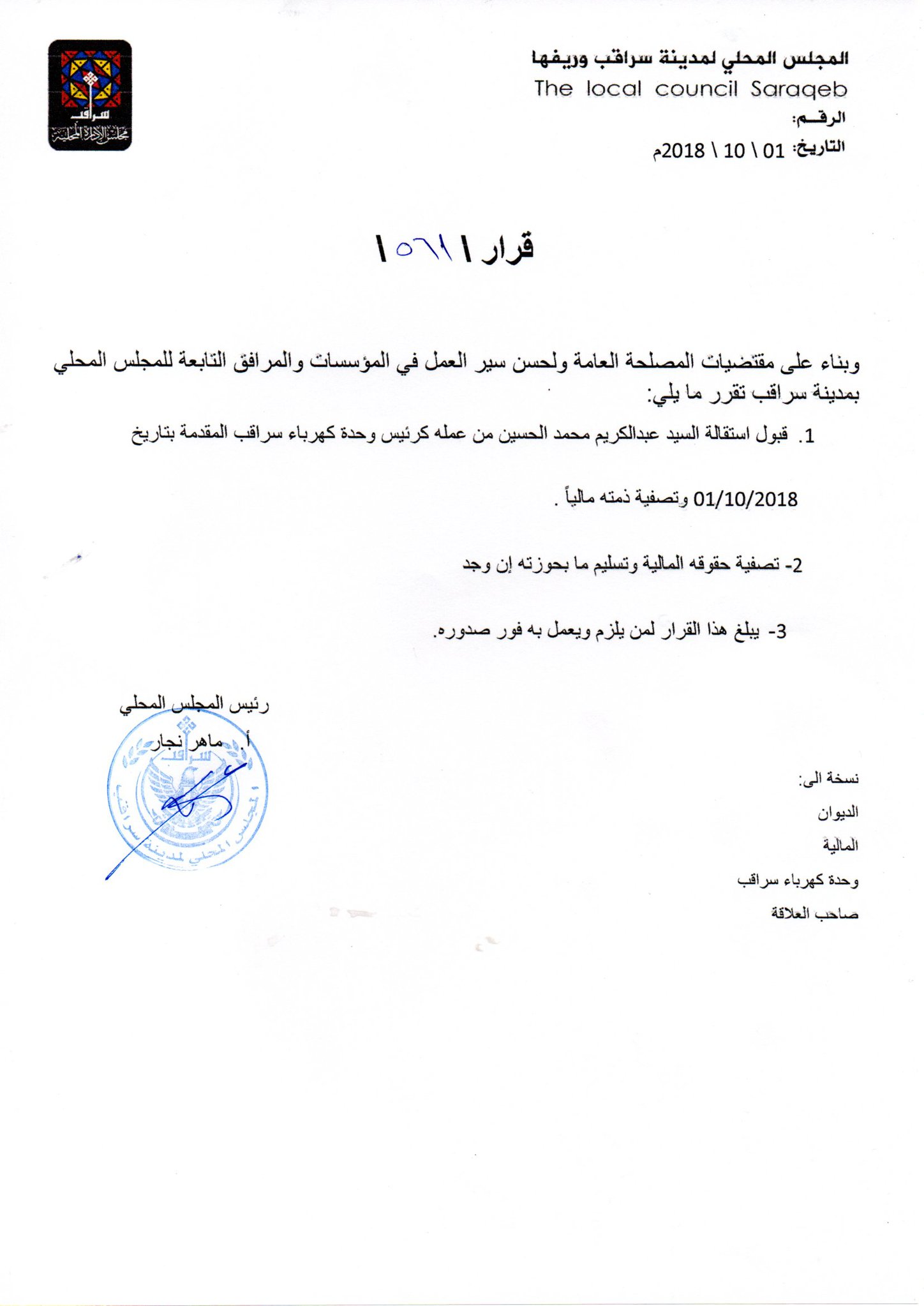 قرار من المجلس المحلي لمدينة سراقب بقبول استقالة عبد الكريم محمد الحسين من عمله كرئيس وحدة سراقب