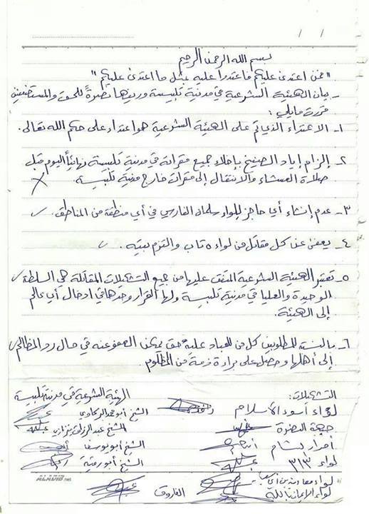 بيان للهيئة الشرعية في مدينة تلبيسة وريفها يقضي بطرد جميع قيادات وأفراد لواء سلمان الفارسي خارج مدينة تلبيسة