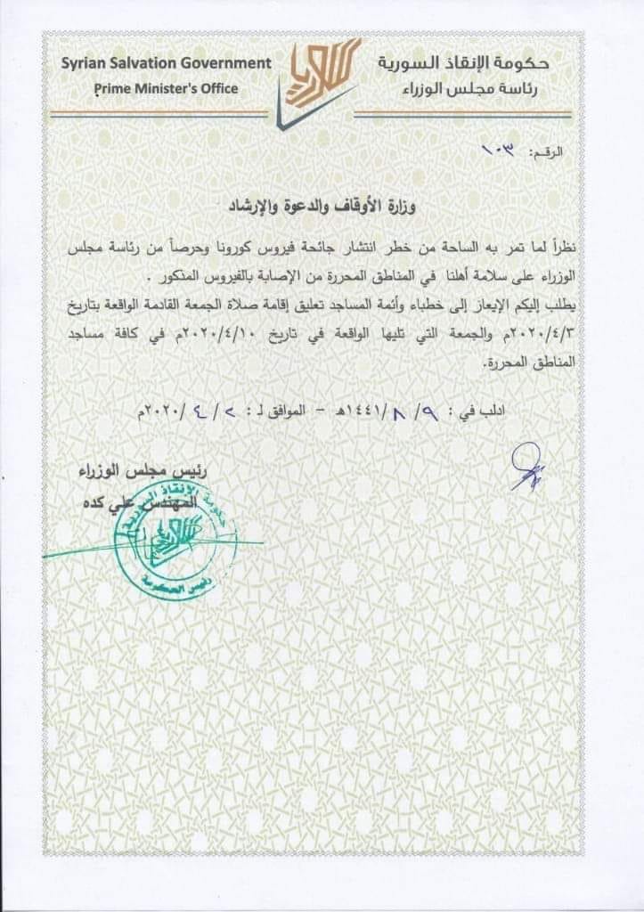 تعميم من وزارة الأوقاف في حكومة الإنقاذ في إدلب تعلّق صلاة الجمعة في مساجد المحافظة تفاديا لانتشار فيروس كورونا