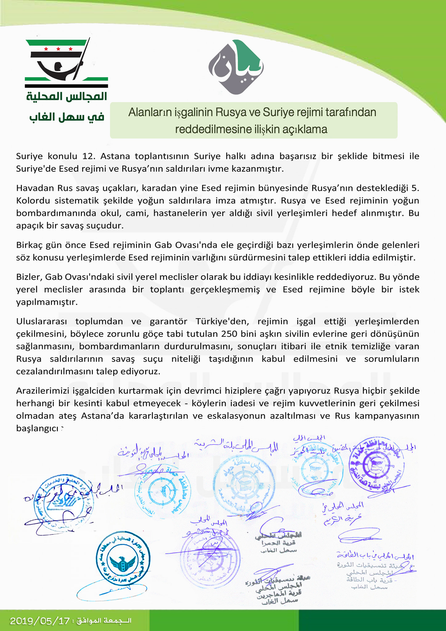 بيان المجالس المحلية في سهل الغاب بخصوص رفض احتلال المناطق من قبل روسيا والنظام السوري