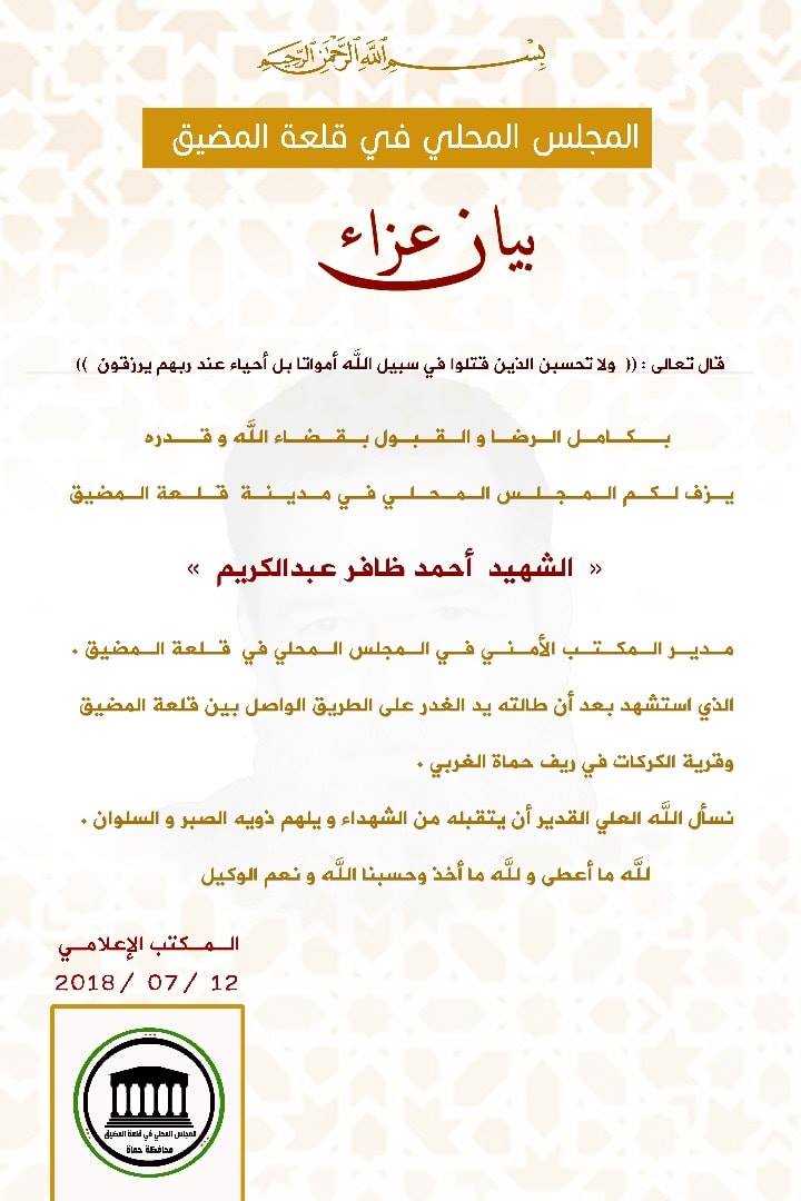 بيان من المجلس المحلي في قلعة المضيق يعزي فيه بمدير المكتب الأمني في المجلس