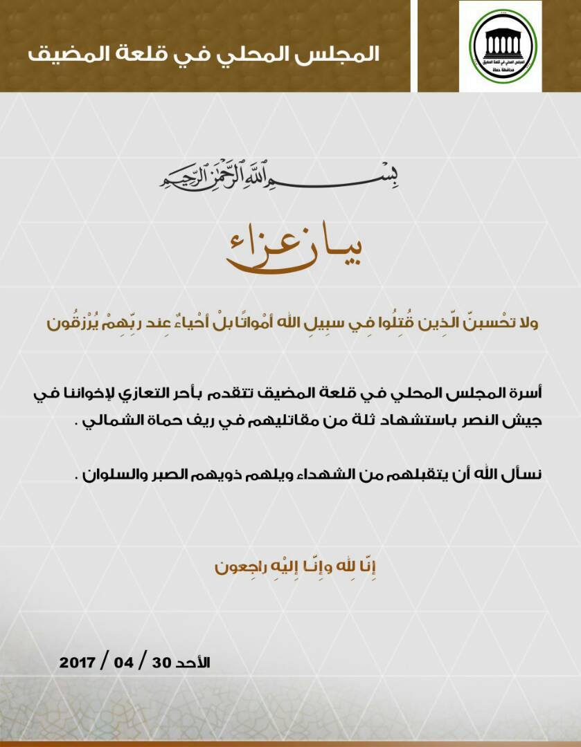 بيان من المجلس المحلي في قلعة المضيق يعزي فيه جيش النصر بمجموعة من مقاتليه على جبهات ريف حماة الشمالي