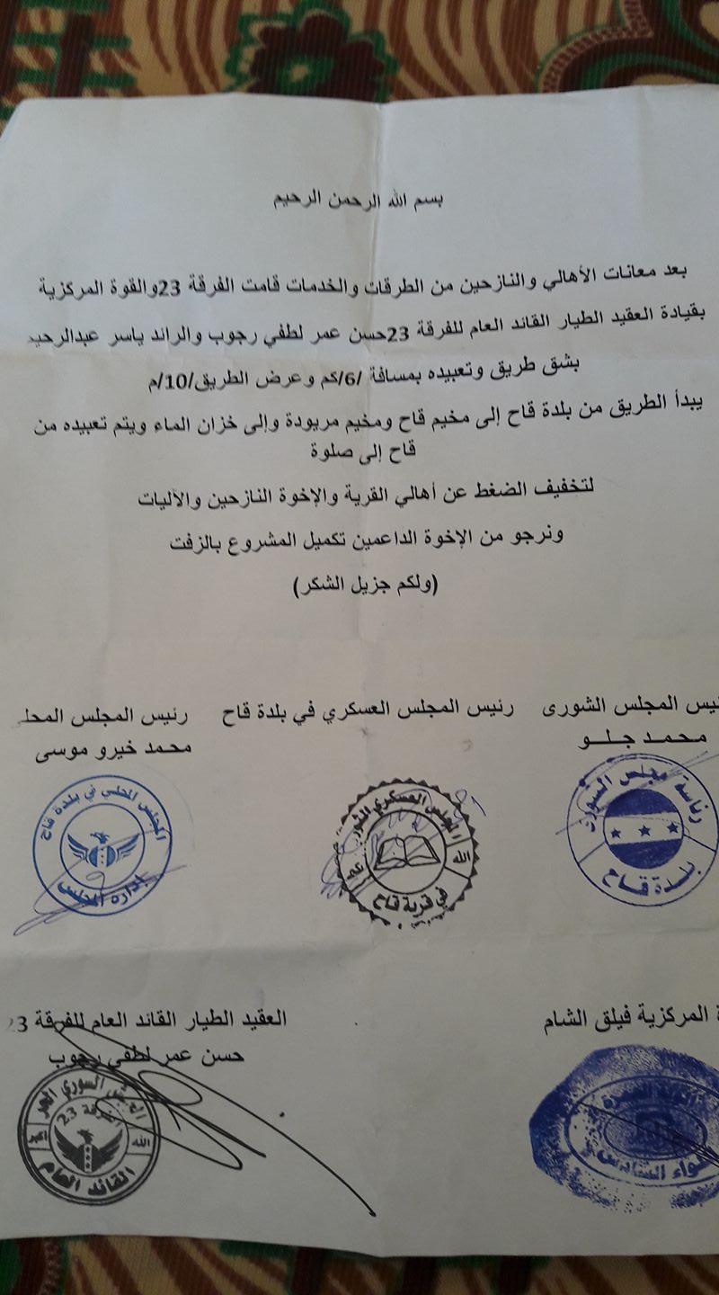 بيان حول فتح الطريق بين بلدة قاح ومخيم قاح ومخيم مريودة وإلى خزان المياه بطول 6 كلم وبعرض 10 متر