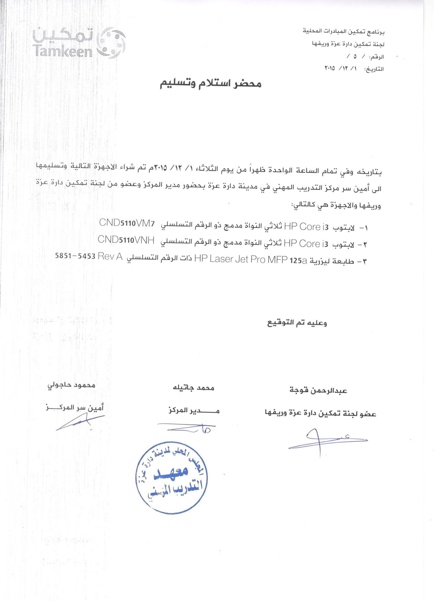محضر من لجنة تمكين دارة عزة وريفها حول الإستلام والتسليم بينها وبين المجلس المحلي