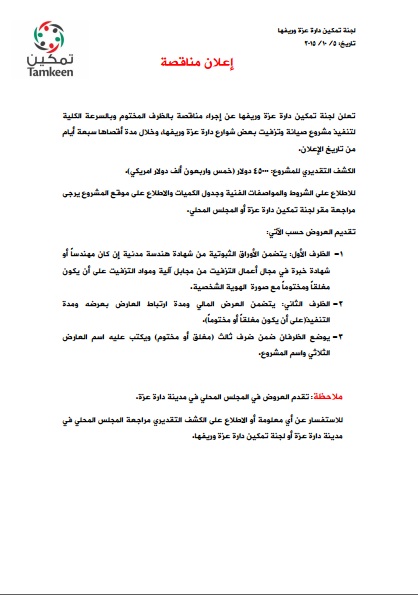 إعلان من لجنة تمكين دارة عزة بخصوص إجراء مناقصة لمشروع صيانة وتزفيت بعض الشوارع الرئيسية في المدينة