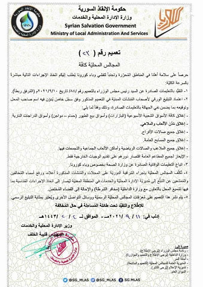 تعميم من وزارة الإدارة المحلية في حكومة الإنقاذ بخصوص إجراءات منع انتشار فيروس كورونا