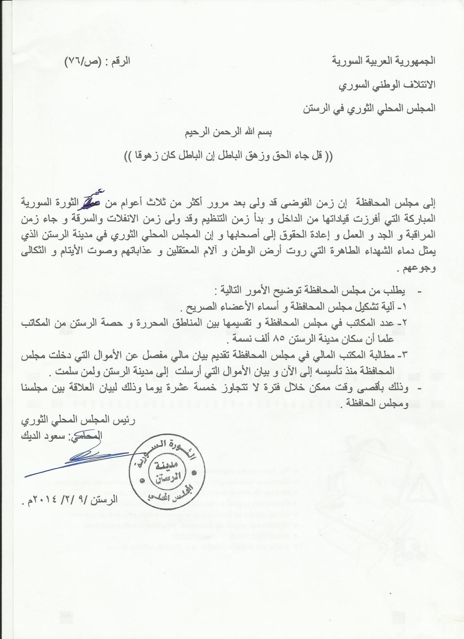 بيان صادر عن المجلس المحلي الثوري في مدينة الرستن موجه إلى مجلس محافظة حمص يطالب فيه توضيح عدة أمور