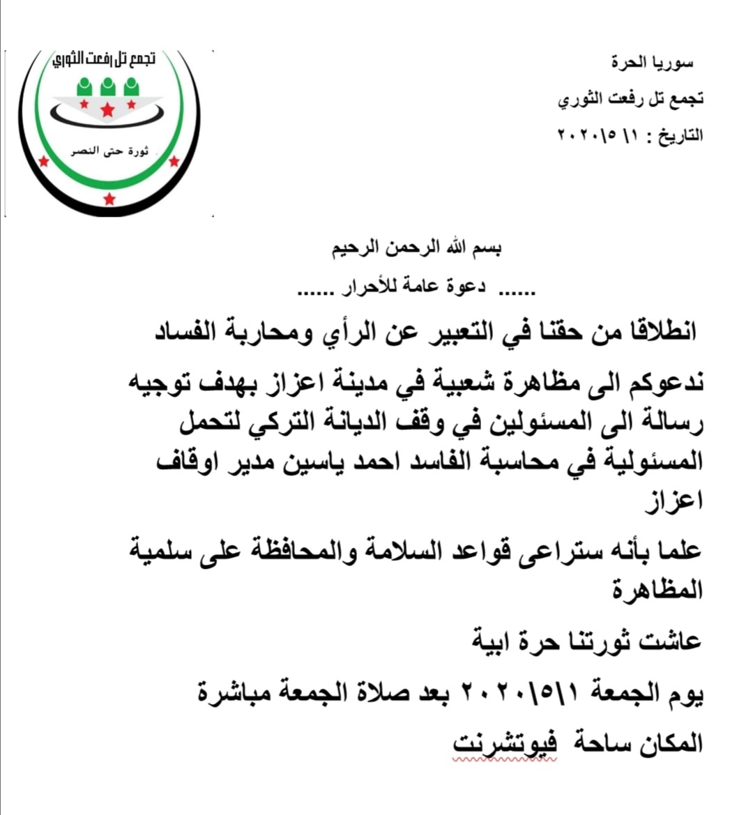 بيان من تجمع تل رفعت الثوري تدعو فيه إلى مظاهرة لمحاربة الفساد ولإيصال رسالة إلى وقف الديانة التركي بشأن الفاسدين